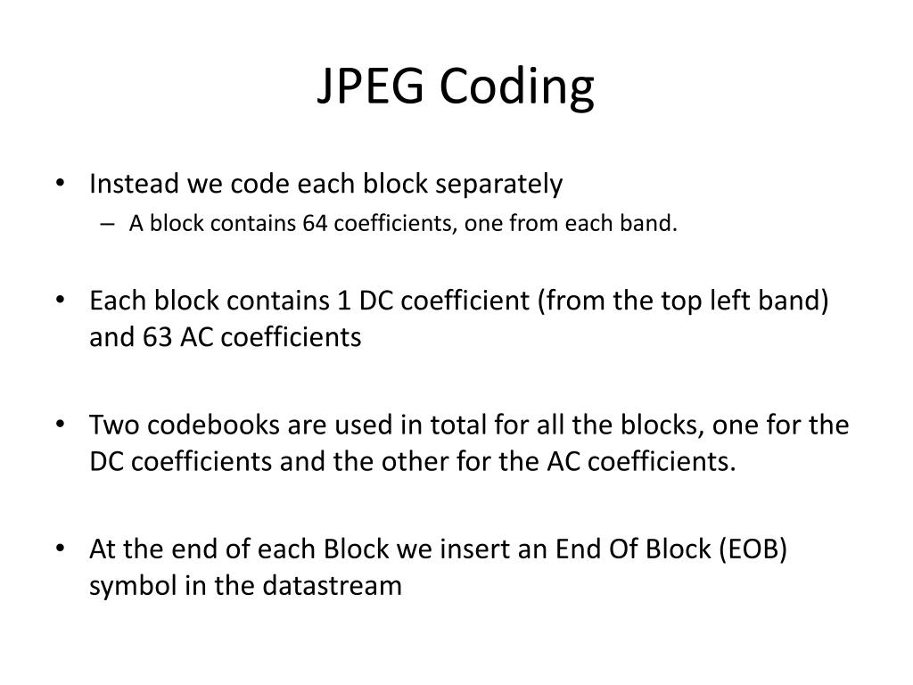 JPEG Coding • Instead we code each block separately • A block contains 64 coefficients, one from each band. • Each block contains 1 DC coefficient (from the top left band) and 63 AC coefficients • Two codebooks are used in total for all the blocks, one for the DC coefficients and the other for the AC coefficients. • At the end of each Block we insert an End Of Block (EOB) symbol in the datastream