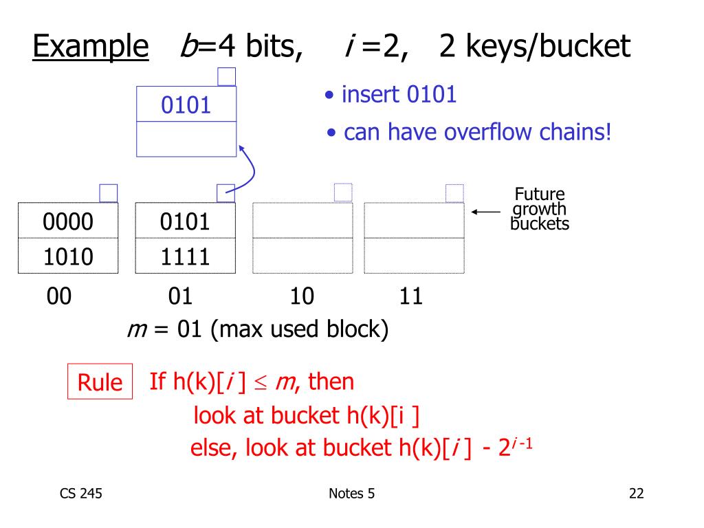 0101 • can have overflow chains! If h(k)[i ] m, then look at bucket h(k)[i ] else, look at bucket h(k)[i ]- 2i -1 Rule Exampleb=4 bits, i =2, 2 keys/bucket • insert 0101 00 01 10 11 Future growth buckets 0000 0101 1010 1111 m = 01 (max used block) Notes 5