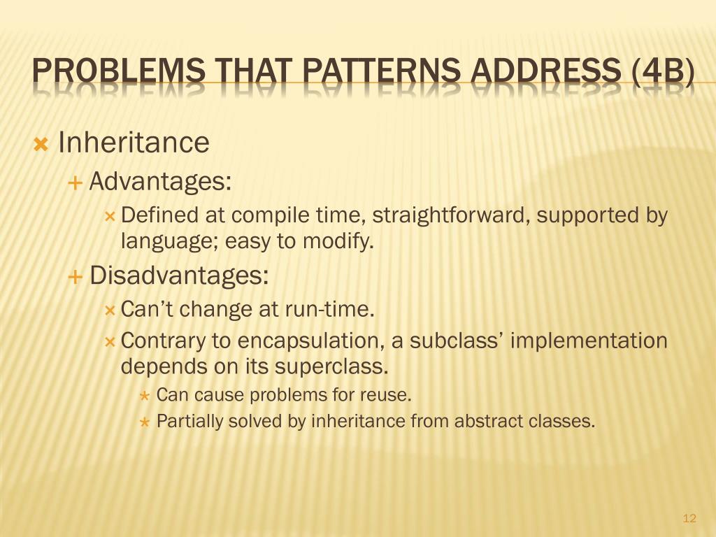 Inheritance • Advantages: • Defined at compile time, straightforward, supported by language; easy to modify. • Disadvantages: • Can’t change at run-time. • Contrary to encapsulation, a subclass’ implementation depends on its superclass. • Can cause problems for reuse. • Partially solved by inheritance from abstract classes. Problems That Patterns Address (4b)