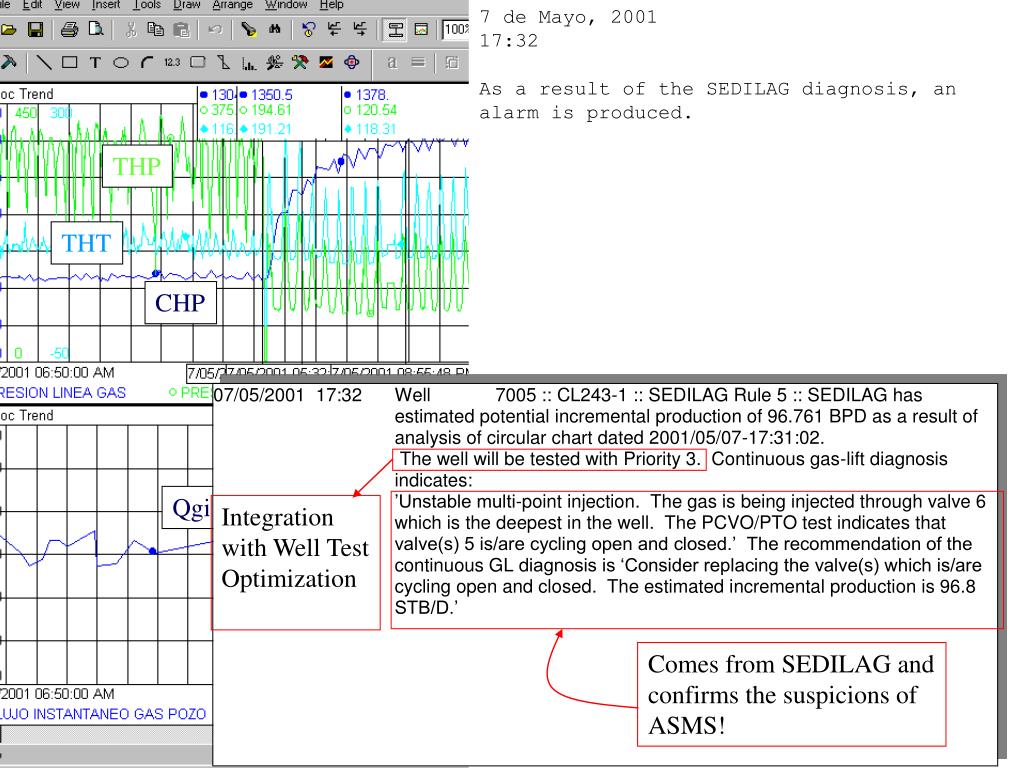 7 de Mayo, 2001 17:32 As a result of the SEDILAG diagnosis, an alarm is produced. Integrationwith Well TestOptimization Comes from SEDILAG andconfirms the suspicions ofASMS! THP THT CHP Qgi 13