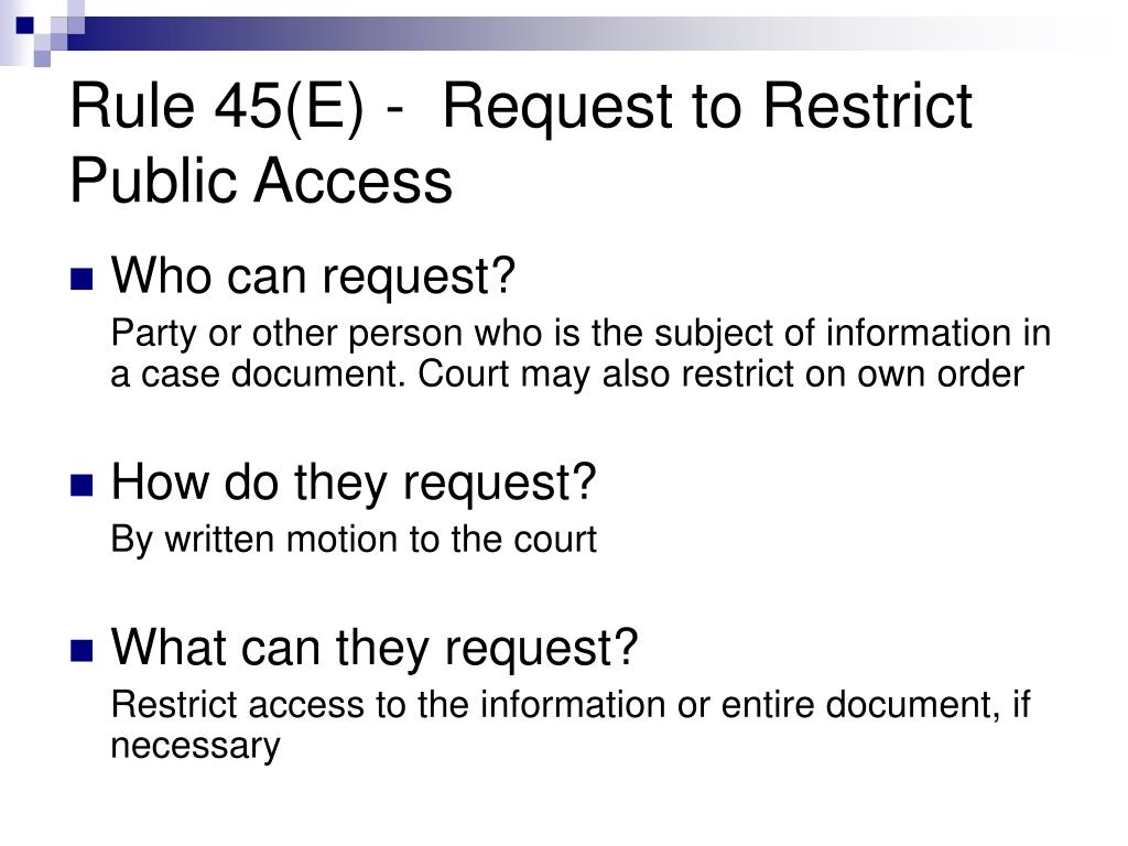 Rule 45(E) - Request to Restrict Public Access • Who can request? Party or other person who is the subject of information in a case document. Court may also restrict on own order • How do they request? By written motion to the court • What can they request? Restrict access to the information or entire document, if necessary