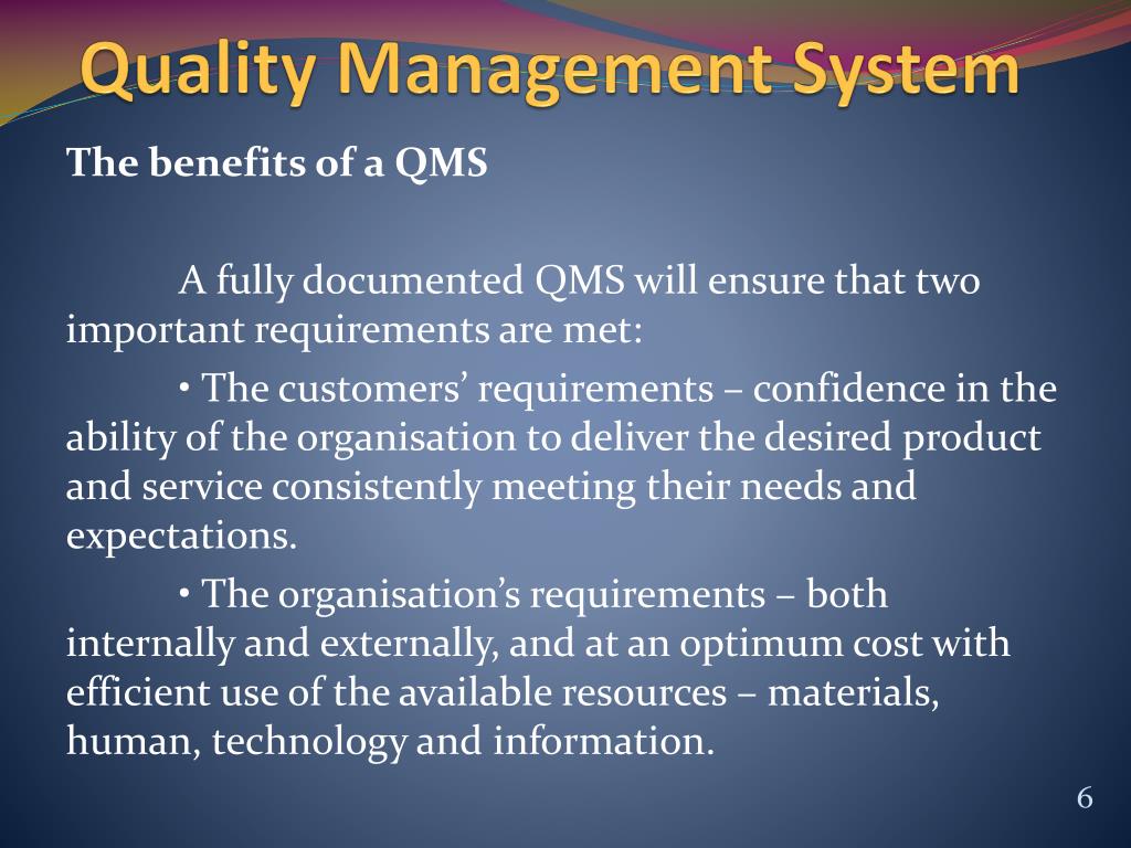Quality Management System The benefits of a QMS A fully documented QMS will ensure that two important requirements are met: • The customers’ requirements – confidence in the ability of the organisation to deliver the desired product and service consistently meeting their needs and expectations. • The organisation’s requirements – both internally and externally, and at an optimum cost with efficient use of the available resources – materials, human, technology and information.