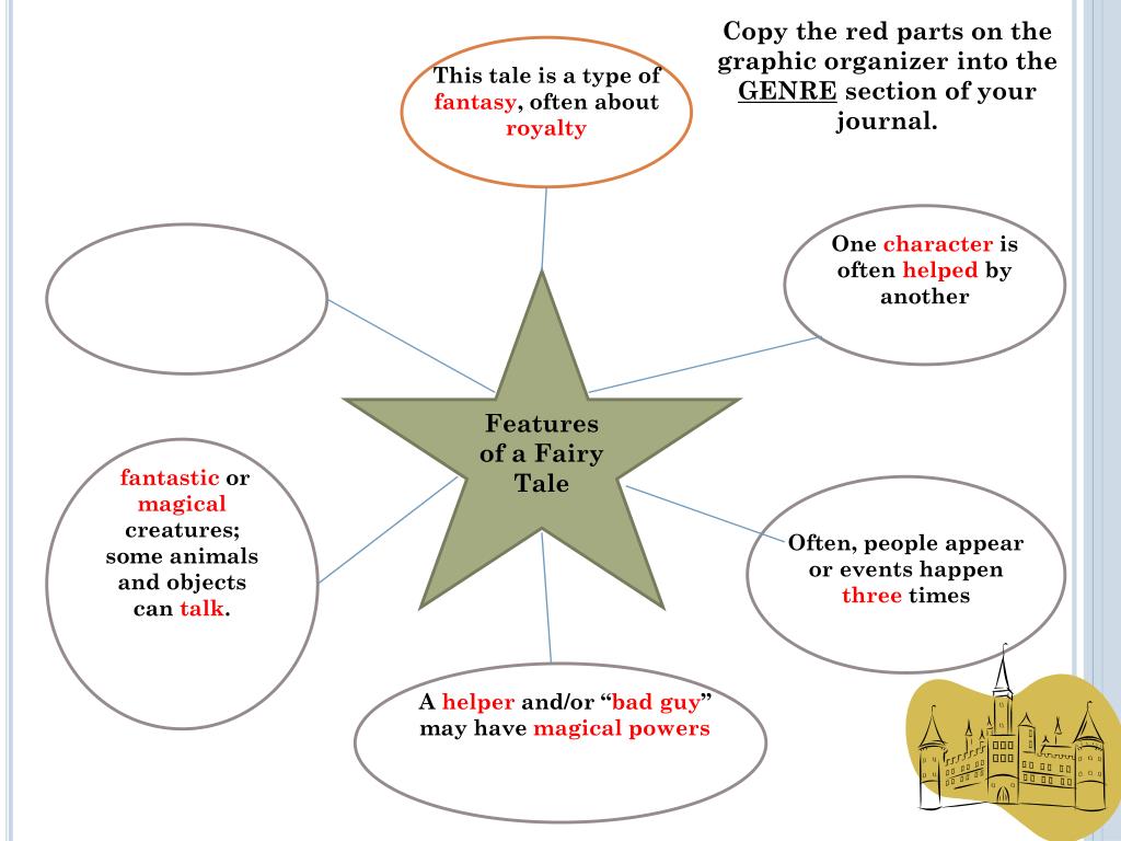 Copy the red parts on the graphic organizer into the GENRE section of your journal. This tale is a type of fantasy, often about royalty One character is often helped by another Features of a Fairy Tale fantastic or magical creatures; some animals and objects can talk. Often, people appear or events happen three times A helper and/or “bad guy” may have magical powers