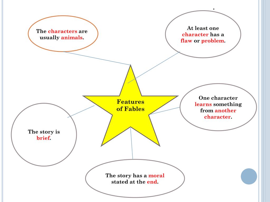 . At least one character has a flaw or problem. The characters are usually animals. One character learns something from another character. Features of Fables