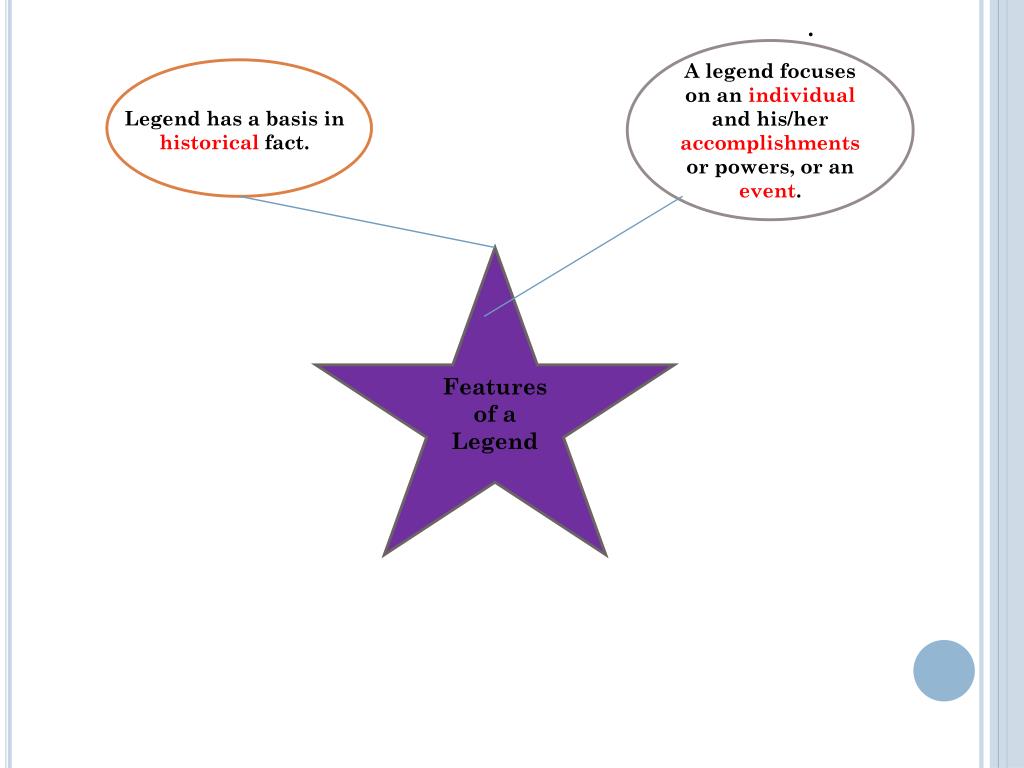 . A legend focuses on an individual and his/her accomplishments or powers, or an event. Legend has a basis in historical fact. Features of a Legend