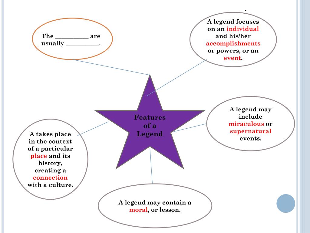 . A legend focuses on an individual and his/her accomplishments or powers, or an event. The ___________ are usually ___________. A legend may include miraculous or supernatural events. Features of a Legend A takes place in the context of a particular place and its history, creating a connection with a culture. A legend may contain a moral, or lesson.