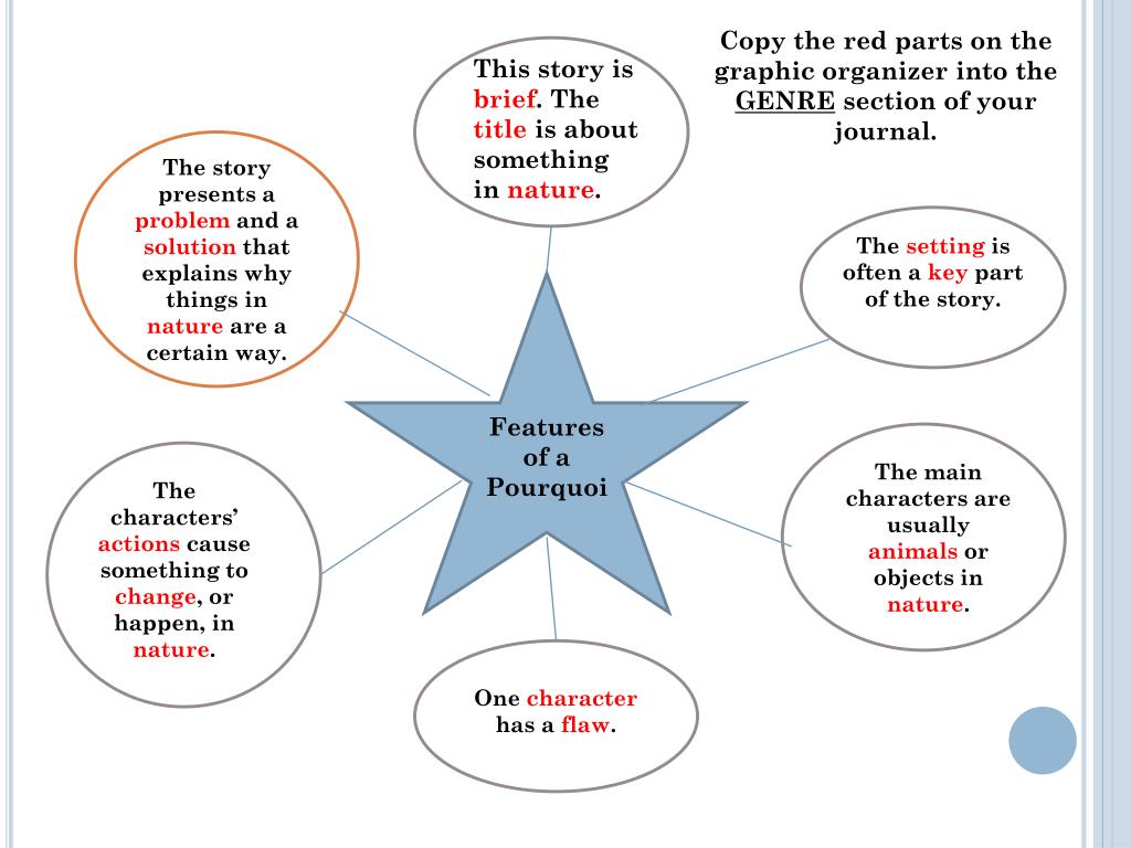 Copy the red parts on the graphic organizer into the GENRE section of your journal. The story presents a problem and a solution that explains why things in nature are a certain way. Features of a Pourquoi
