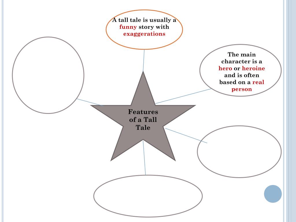 A tall tale is usually a funny story with exaggerations The main character is a hero or heroine and is often based on a realperson Features of a Tall Tale