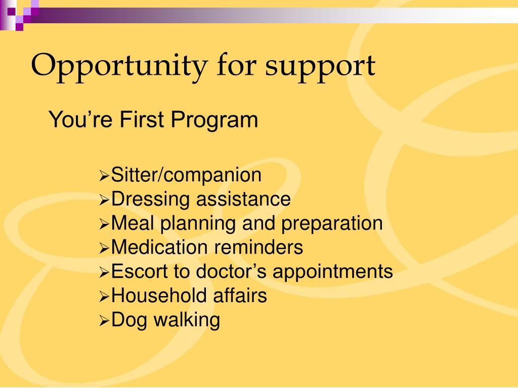 Opportunity for support You’re First Program • Sitter/companion • Dressing assistance • Meal planning and preparation • Medication reminders • Escort to doctor’s appointments • Household affairs • Dog walking