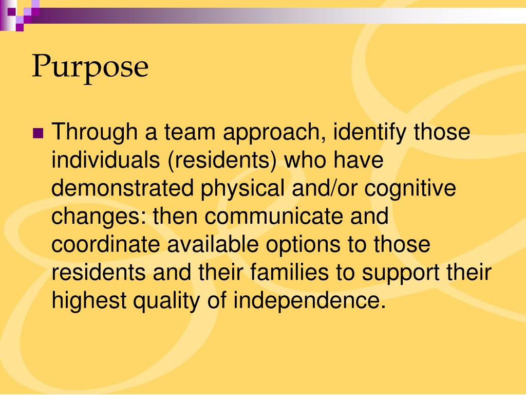 Purpose • Through a team approach, identify those individuals (residents) who have demonstrated physical and/or cognitive changes: then communicate and coordinate available options to those residents and their families to support their highest quality of independence.