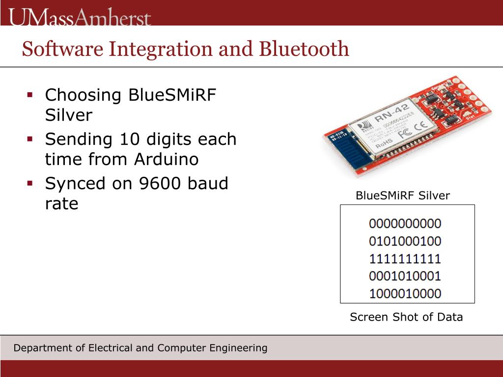 Software Integration and Bluetooth • Choosing BlueSMiRF Silver • Sending 10 digits each time from Arduino • Synced on 9600 baud rate BlueSMiRF Silver Screen Shot of Data