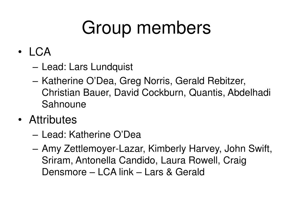 Group members • LCA • Lead: Lars Lundquist • Katherine O’Dea, Greg Norris, Gerald Rebitzer, Christian Bauer, David Cockburn, Quantis, Abdelhadi Sahnoune • Attributes • Lead: Katherine O’Dea • Amy Zettlemoyer-Lazar, Kimberly Harvey, John Swift, Sriram, Antonella Candido, Laura Rowell, Craig Densmore – LCA link – Lars & Gerald