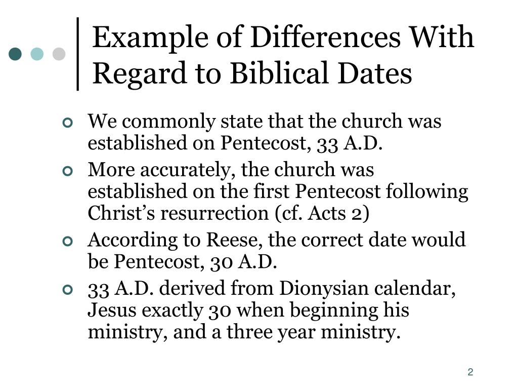 Example of Differences With Regard to Biblical Dates • We commonly state that the church was established on Pentecost, 33 A.D. • More accurately, the church was established on the first Pentecost following Christ’s resurrection (cf. Acts 2) • According to Reese, the correct date would be Pentecost, 30 A.D. • 33 A.D. derived from Dionysian calendar, Jesus exactly 30 when beginning his ministry, and a three year ministry.