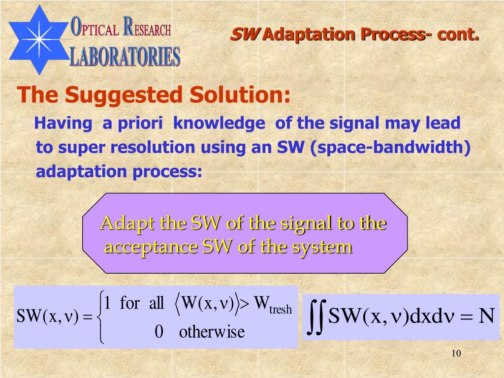 Adapt the SW of the signal to the acceptance SW of the system SW Adaptation Process- cont. The Suggested Solution: Having a priori knowledge of the signal may lead to super resolution using an SW (space-bandwidth) adaptation process: