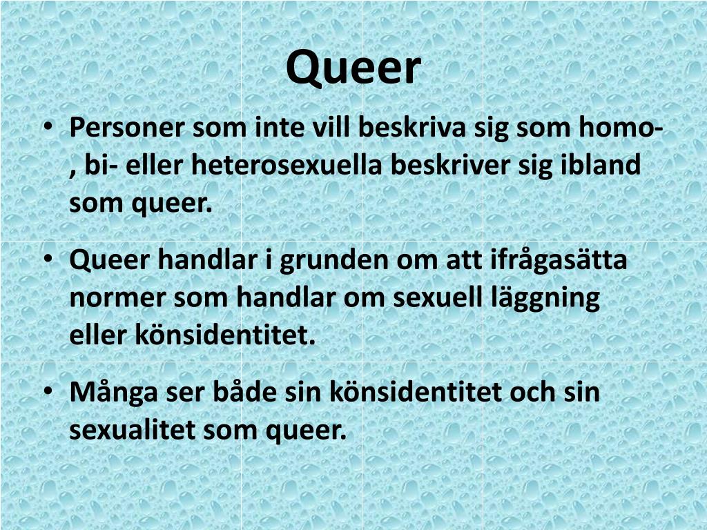 Queer • Personer som inte vill beskriva sig som homo-, bi- eller heterosexuella beskriver sig ibland som queer. • Queer handlar i grunden om att ifrågasätta normer som handlar om sexuell läggning eller könsidentitet. • Många ser både sin könsidentitet och sin sexualitet som queer.