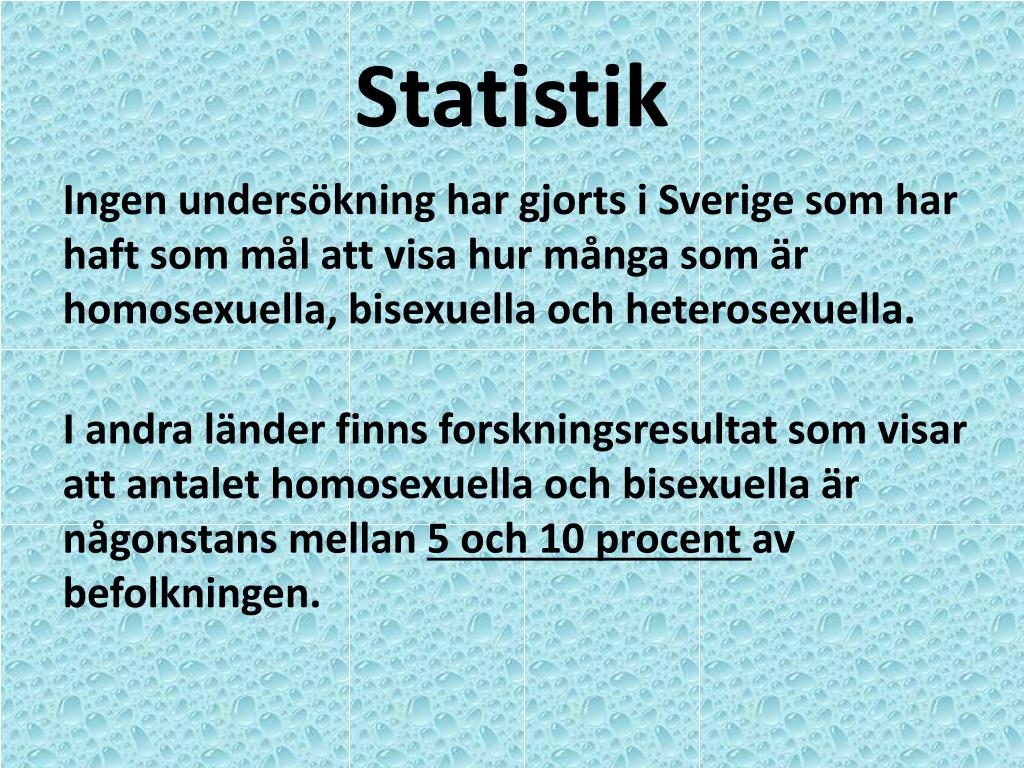 Statistik Ingen undersökning har gjorts i Sverige som har haft som mål att visa hur många som är homosexuella, bisexuella och heterosexuella. I andra länder finns forskningsresultat som visar att antalet homosexuella och bisexuella är någonstans mellan 5 och 10 procent av befolkningen.