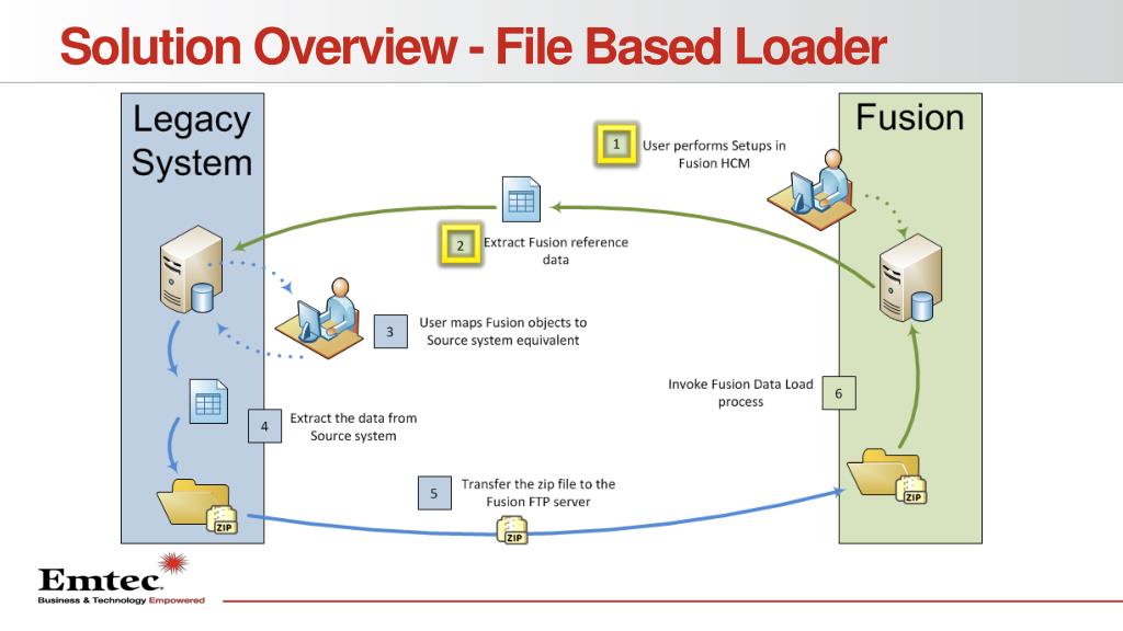 Solution Overview - File Based Loader Step 1 – User Performs Setups in Fusion Configuration Items • Location • Division • Job Family • Job Function • Manager Level • Job Grade and Grade Rate • Grade Ladder • Business Unit Set Assignment • Action • Assignment Status • Reference Data Set • Reference Set Assignment • Enterprise Structure • Legislative Data Group • Legal Address • Legal Entity • Job Code • Action and Reasons • Action Reason