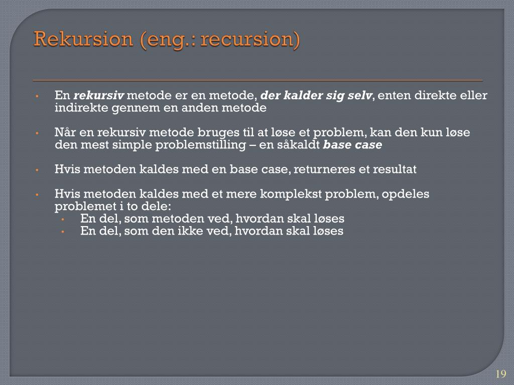 Rekursion (eng.: recursion) • En rekursiv metode er en metode, der kalder sig selv, enten direkte eller indirekte gennem en anden metode • Når en rekursiv metode bruges til at løse et problem, kan den kun løse den mest simple problemstilling – en såkaldt base case • Hvis metoden kaldes med en base case, returneres et resultat • Hvis metoden kaldes med et mere komplekst problem, opdeles problemet i to dele: • En del, som metoden ved, hvordan skal løses • En del, som den ikke ved, hvordan skal løses