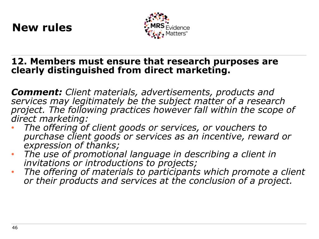 New rules • 12. Members must ensure that research purposes are clearly distinguished from direct marketing. • Comment: Client materials, advertisements, products and services may legitimately be the subject matter of a research project. The following practices however fall within the scope of direct marketing: • The offering of client goods or services, or vouchers to purchase client goods or services as an incentive, reward or expression of thanks; • The use of promotional language in describing a client in invitations or introductions to projects; • The offering of materials to participants which promote a client or their products and services at the conclusion of a project.