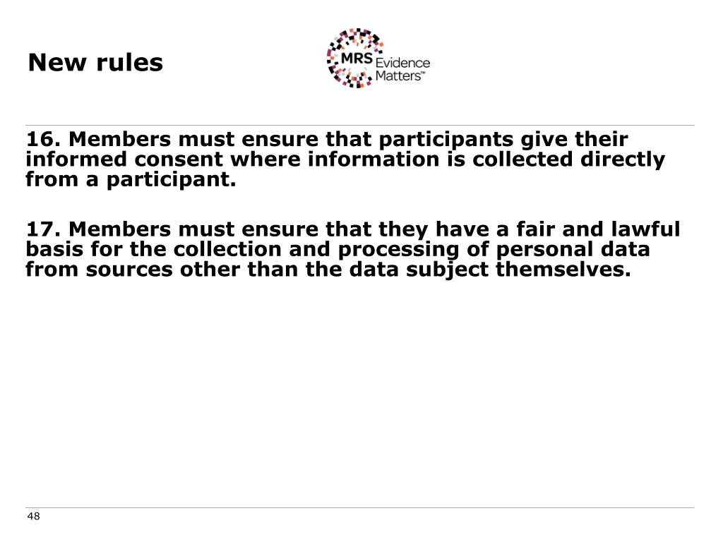 New rules • 16. Members must ensure that participants give their informed consent where information is collected directly from a participant. • 17. Members must ensure that they have a fair and lawful basis for the collection and processing of personal data from sources other than the data subject themselves.