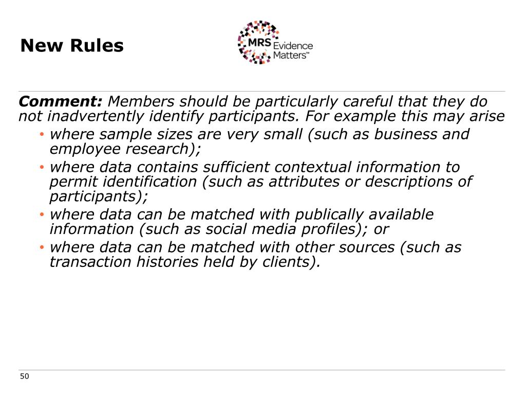 New Rules • Comment: Members should be particularly careful that they do not inadvertently identify participants. For example this may arise • where sample sizes are very small (such as business and employee research); • where data contains sufficient contextual information to permit identification (such as attributes or descriptions of participants); • where data can be matched with publically available information (such as social media profiles); or • where data can be matched with other sources (such as transaction histories held by clients).