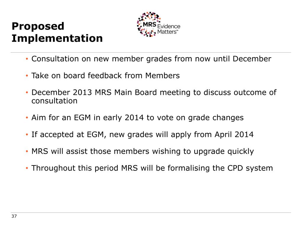 Proposed Implementation • Consultation on new member grades from now until December • Take on board feedback from Members • December 2013 MRS Main Board meeting to discuss outcome of consultation • Aim for an EGM in early 2014 to vote on grade changes • If accepted at EGM, new grades will apply from April 2014 • MRS will assist those members wishing to upgrade quickly • Throughout this period MRS will be formalising the CPD system