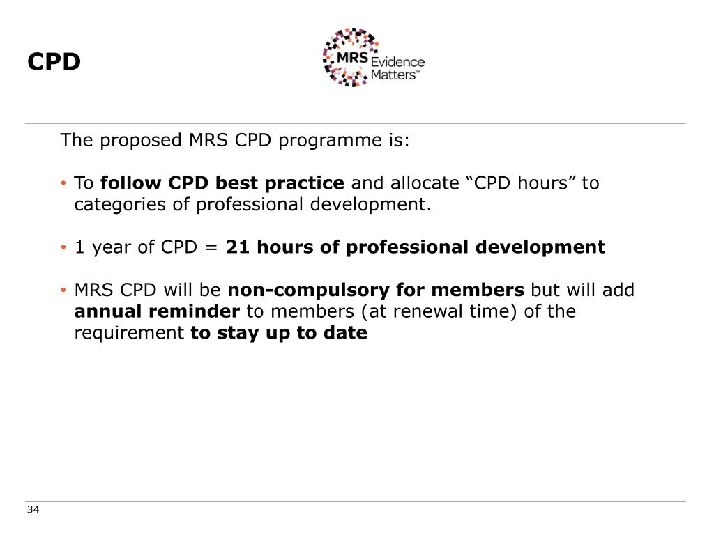 CPD The proposed MRS CPD programme is: • To follow CPD best practice and allocate “CPD hours” to categories of professional development. • 1 year of CPD = 21 hours of professional development • MRS CPD will be non-compulsory for members but will add annual reminder to members (at renewal time) of the requirement to stay up to date