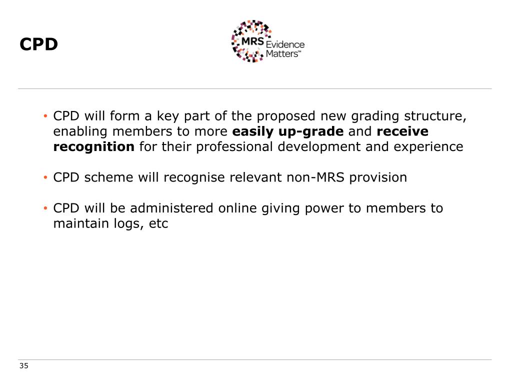 CPD • CPD will form a key part of the proposed new grading structure, enabling members to more easily up-grade and receive recognition for their professional development and experience • CPD scheme will recognise relevant non-MRS provision • CPD will be administered online giving power to members to maintain logs, etc
