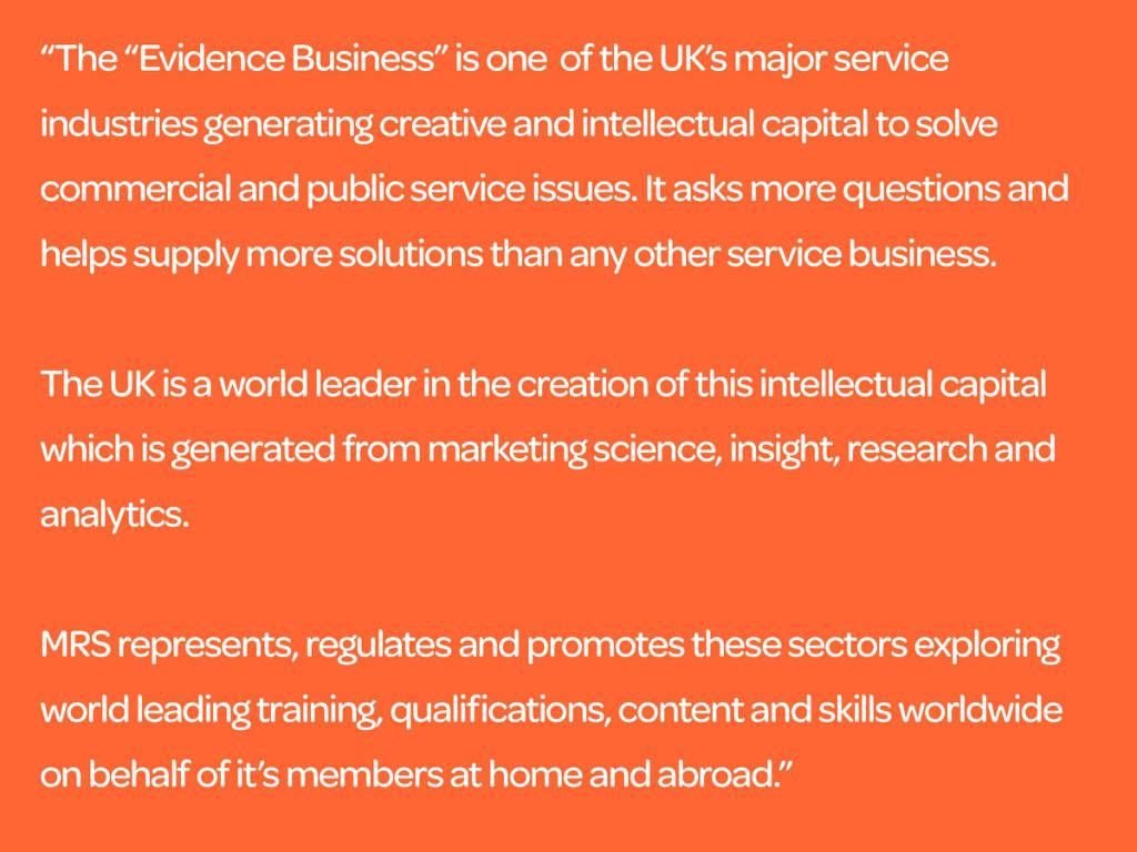 “The “Evidence Business” is one of the UK’s major service industries generating creative and intellectual capital to solve commercial and public service issues. It asks more questions and helps supply more solutions than any other service business. • The UK is a world leader in the creation of this intellectual capital which is generated from marketing science, insight, research and analytics. • MRS represents, regulates and promotes these sectors exploring world leading training, qualifications, content and skills worldwide on behalf of it’s members at home and abroad.”