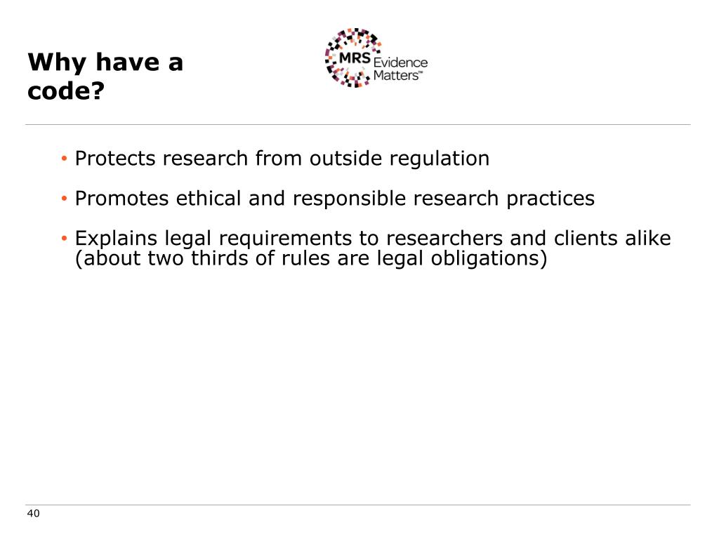 Why have a code? • Protects research from outside regulation • Promotes ethical and responsible research practices • Explains legal requirements to researchers and clients alike (about two thirds of rules are legal obligations)