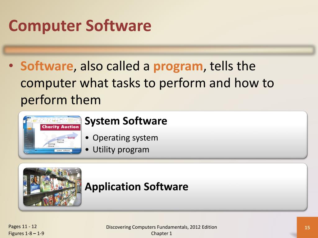 Computer Software • Software, also called a program, tells the computer what tasks to perform and how to perform them Pages 11 - 12 Figures 1-8 – 1-9 Discovering Computers Fundamentals, 2012 Edition Chapter 1