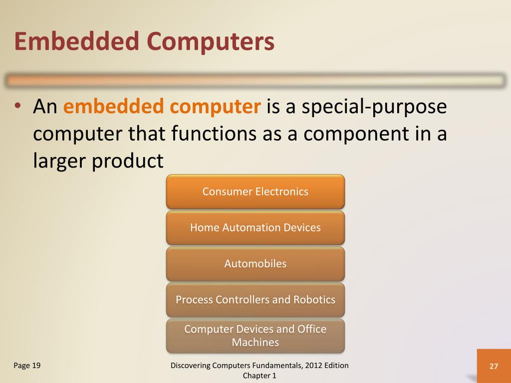 Embedded Computers • An embedded computeris a special-purpose computer that functions as a component in a larger product Page 19 Discovering Computers Fundamentals, 2012 Edition Chapter 1