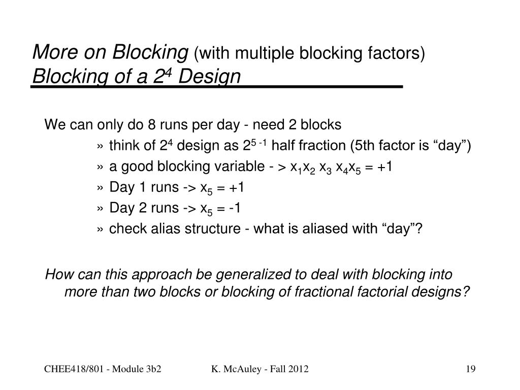 More on Blocking (with multiple blocking factors)Blocking of a 24 Design We can only do 8 runs per day - need 2 blocks • think of 24 design as 25 -1 half fraction (5th factor is “day”) • a good blocking variable - > x1x2 x3 x4x5 = +1 • Day 1 runs -> x5 = +1 • Day 2 runs -> x5 = -1 • check alias structure - what is aliased with “day”? How can this approach be generalized to deal with blocking into more than two blocks or blocking of fractional factorial designs? K. McAuley - Fall 2012