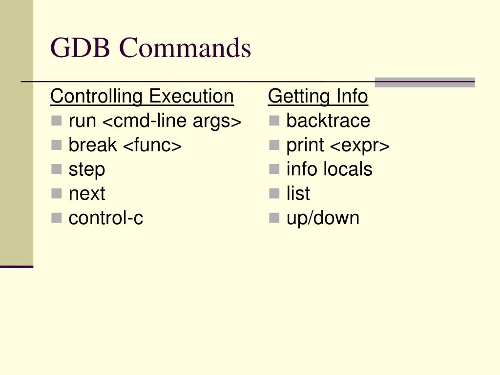 GDB Commands Controlling Execution run <cmd-line args> break <func> step next control-c Getting Info backtrace print <expr> info locals list up/down