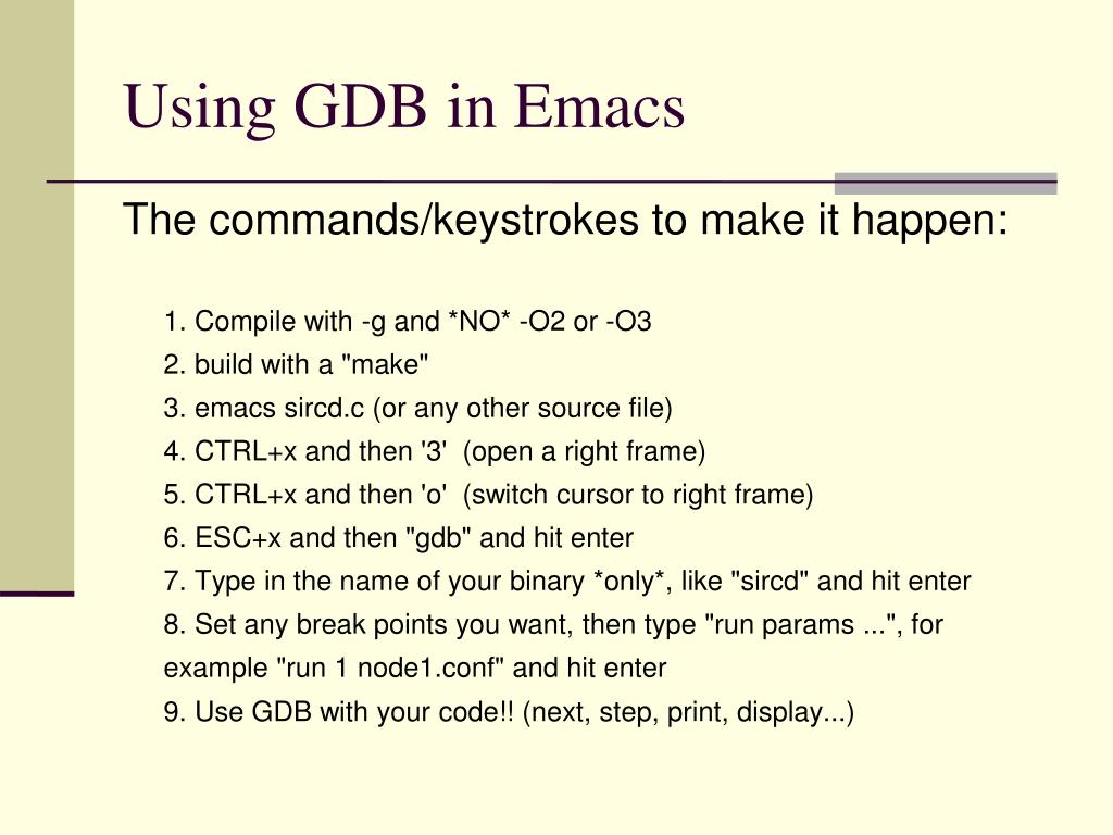 Using GDB in Emacs The commands/keystrokes to make it happen: 1. Compile with -g and *NO* -O2 or -O32. build with a "make"3. emacs sircd.c (or any other source file)4. CTRL+x and then '3' (open a right frame)5. CTRL+x and then 'o' (switch cursor to right frame)6. ESC+x and then "gdb" and hit enter7. Type in the name of your binary *only*, like "sircd" and hit enter8. Set any break points you want, then type "run params ...", forexample "run 1 node1.conf" and hit enter9. Use GDB with your code!! (next, step, print, display...)