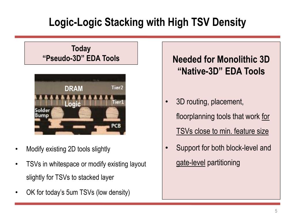 Logic-Logic Stacking with High TSV Density Today “Pseudo-3D” EDA Tools • Needed for Monolithic 3D • “Native-3D” EDA Tools • 3D routing, placement, floorplanning tools that work for TSVs close to min. feature size • Support for both block-level and gate-level partitioning DRAM Logic Modify existing 2D tools slightly TSVs in whitespace or modify existing layout slightly for TSVs to stacked layer OK for today’s 5um TSVs (low density)
