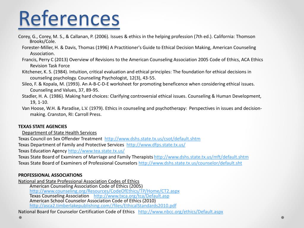 References Corey, G., Corey, M. S., & Callanan, P. (2006). Issues & ethics in the helping profession (7th ed.). California: Thomson Brooks/Cole. Forester-Miller, H. & Davis, Thomas (1996) A Practitioner's Guide to Ethical Decision Making, American Counseling Association. Francis, Perry C (2013) Overview of Revisions to the American Counseling Association 2005 Code of Ethics, ACA Ethics Revision Task Force Kitchener, K. S. (1984). Intuition, critical evaluation and ethical principles: The foundation for ethical decisions in counseling psychology. Counseling Psychologist, 12(3), 43-55. Sileo, F. & Kopala, M. (1993). An A-B-C-D-E worksheet for promoting beneficence when considering ethical issues. Counseling and Values, 37, 89-95. Stadler, H. A. (1986). Making hard choices: Clarifying controversial ethical issues. Counseling & Human Development, 19, 1-10. Van Hoose, W.H. & Paradise, L.V. (1979). Ethics in counseling and psychotherapy: Perspectives in issues and decision- making. Cranston, RI: Carroll Press. TEXAS STATE AGENCIES Department of State Health Services Texas Council on Sex Offender Treatment http://www.dshs.state.tx.us/csot/default.shtm Texas Department of Family and Protective Services http://www.dfps.state.tx.us/ Texas Education Agency http://www.tea.state.tx.us/ Texas State Board of Examiners of Marriage and Family Therapists http://www.dshs.state.tx.us/mft/default.shtm Texas State Board of Examiners of Professional Counselors http://www.dshs.state.tx.us/counselor/default.sht PROFESSIONAL ASSOCIATIONS National and State Professional Association Codes of EthicsAmerican Counseling Association Code of Ethics (2005) http://www.counseling.org/Resources/CodeOfEthics/TP/Home/CT2.aspxTexas Counseling Association http://www.txca.org/tca/Default.aspAmerican School Counselor Association Code of Ethics (2010)http://asca2.timberlakepublishing.com//files/EthicalStandards2010.pdf National Board for Counselor Certification Code of Ethics http://www.nbcc.org/ethics/Default.aspx