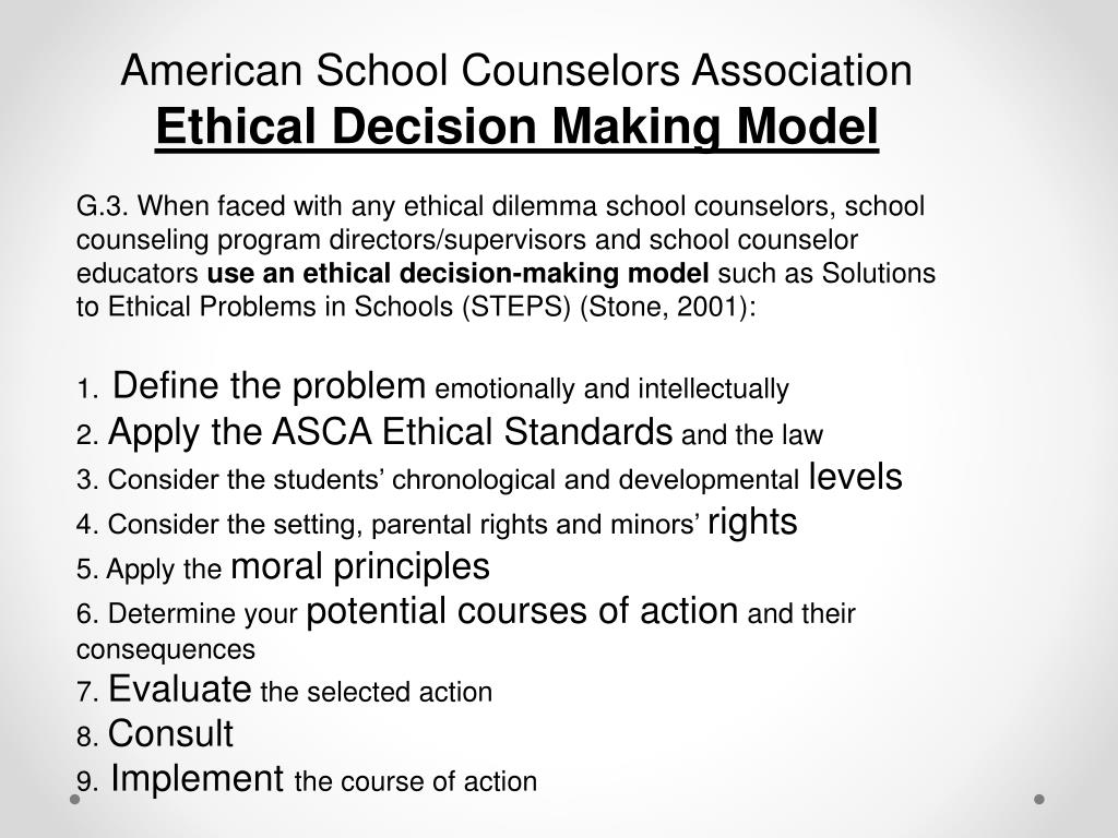 American School Counselors Association Ethical Decision Making Model G.3. When faced with any ethical dilemma school counselors, school counseling program directors/supervisors and school counselor educators use an ethical decision-making model such as Solutions to Ethical Problems in Schools (STEPS) (Stone, 2001): 1.Define the problem emotionally and intellectually 2. Apply the ASCA Ethical Standards and the law 3. Consider the students’ chronological and developmental levels 4. Consider the setting, parental rights and minors’ rights 5. Apply the moral principles 6. Determine your potential courses of action and their consequences 7. Evaluate the selected action 8. Consult 9. Implement the course of action