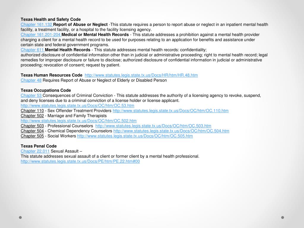 Texas Health and Safety Code Chapter 161.132 Report of Abuse or Neglect -This statute requires a person to report abuse or neglect in an inpatient mental health facility, a treatment facility, or a hospital to the facility licensing agency. Chapter 161.201-204 Medical or Mental Health Records - This statute addresses a prohibition against a mental health provider charging a client for a mental health record to be used for purposes relating to an application for benefits and assistance under certain state and federal government programs. Chapter 611 Mental Health Records - This statute addresses mental health records: confidentiality; authorized disclosure of confidential information other than in judicial or administrative proceeding; right to mental health record; legal remedies for improper disclosure or failure to disclose; authorized disclosure of confidential information in judicial or administrative proceeding; revocation of consent; request by patient. Texas Human Resources Code http://www.statutes.legis.state.tx.us/Docs/HR/htm/HR.48.htmChapter 48 Requires Report of Abuse or Neglect of Elderly or Disabled Person Texas Occupations Code Chapter 53 Consequences of Criminal Conviction - This statute addresses the authority of a licensing agency to revoke, suspend, and deny licenses due to a criminal conviction of a license holder or license applicant. http://www.statutes.legis.state.tx.us/Docs/OC/htm/OC.53.htmChapter 110 - Sex Offender Treatment Providers http://www.statutes.legis.state.tx.us/Docs/OC/htm/OC.110.htmChapter 502 - Marriage and Family Therapistshttp://www.statutes.legis.state.tx.us/Docs/OC/htm/OC.502.htmChapter 503 - Professional Counselors http://www.statutes.legis.state.tx.us/Docs/OC/htm/OC.503.htmChapter 504 - Chemical Dependency Counselors http://www.statutes.legis.state.tx.us/Docs/OC/htm/OC.504.htmChapter 505 - Social Workers http://www.statutes.legis.state.tx.us/Docs/OC/htm/OC.505.htm Texas Penal Code Chapter 22.011 Sexual Assault – This statute addresses sexual assault of a client or former client by a mental health professional. http://www.statutes.legis.state.tx.us/Docs/PE/htm/PE.22.htm#00