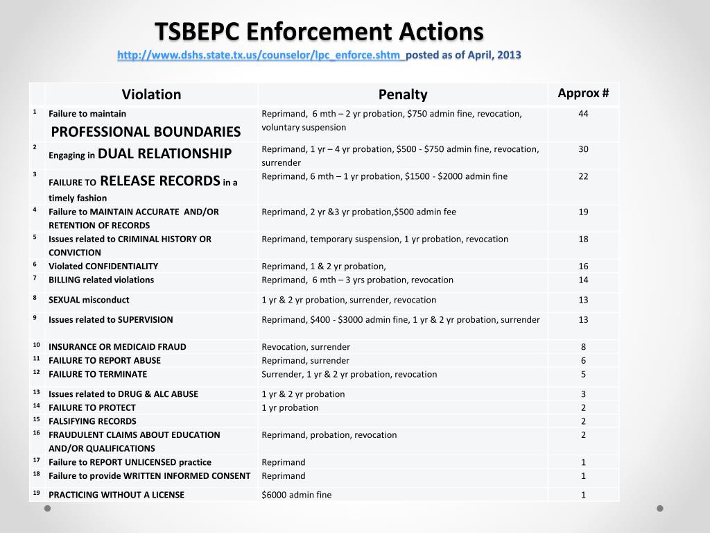 TSBEPC Enforcement Actions http://www.dshs.state.tx.us/counselor/lpc_enforce.shtmposted as of April, 2013