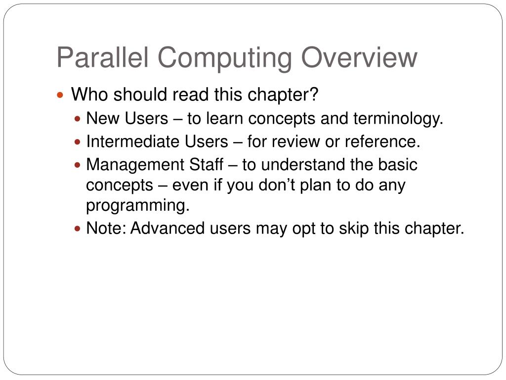 Parallel Computing Overview • Who should read this chapter? • New Users – to learn concepts and terminology. • Intermediate Users – for review or reference. • Management Staff – to understand the basic concepts – even if you don’t plan to do any programming. • Note: Advanced users may opt to skip this chapter.