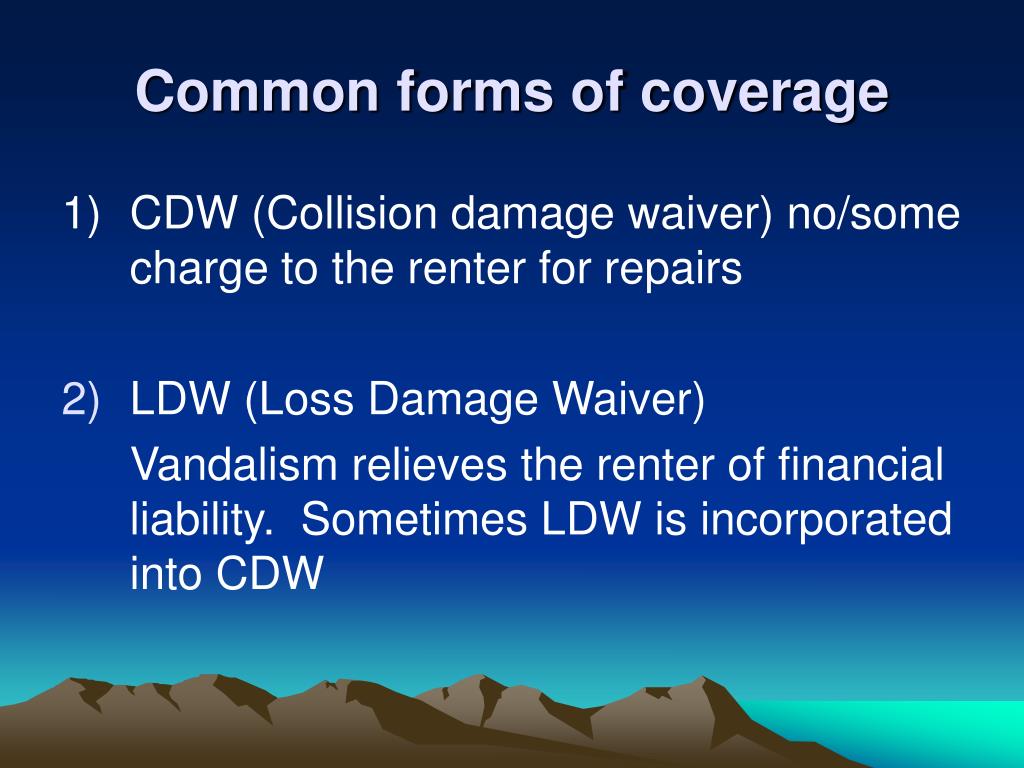 Common forms of coverage 1) CDW (Collision damage waiver) no/some charge to the renter for repairs • LDW (Loss Damage Waiver) Vandalism relieves the renter of financial liability. Sometimes LDW is incorporated into CDW