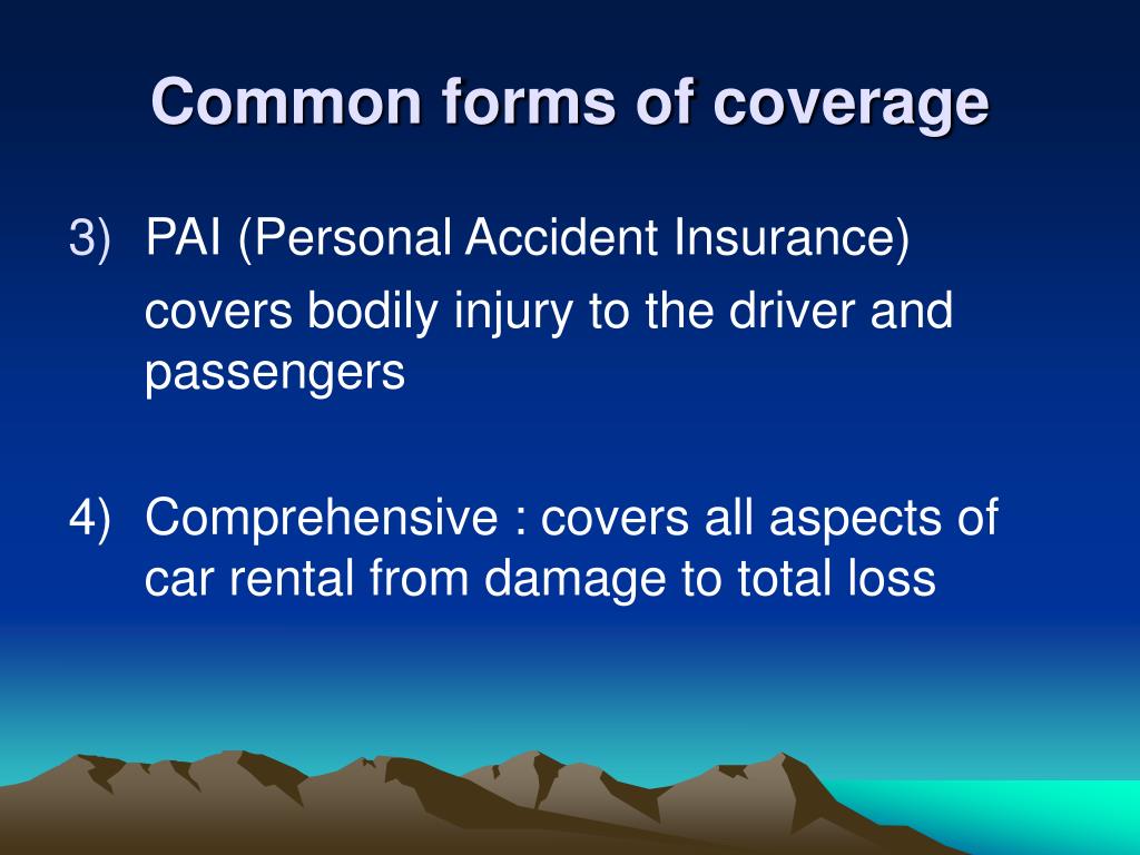 Common forms of coverage • PAI (Personal Accident Insurance) covers bodily injury to the driver and passengers 4) Comprehensive : covers all aspects of car rental from damage to total loss