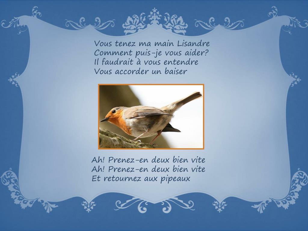Vous tenez ma main LisandreComment puis-je vous aider?Il faudrait à vous entendreVous accorder un baiser Ah! Prenez-en deux bien viteAh! Prenez-en deux bien viteEt retournez aux pipeaux