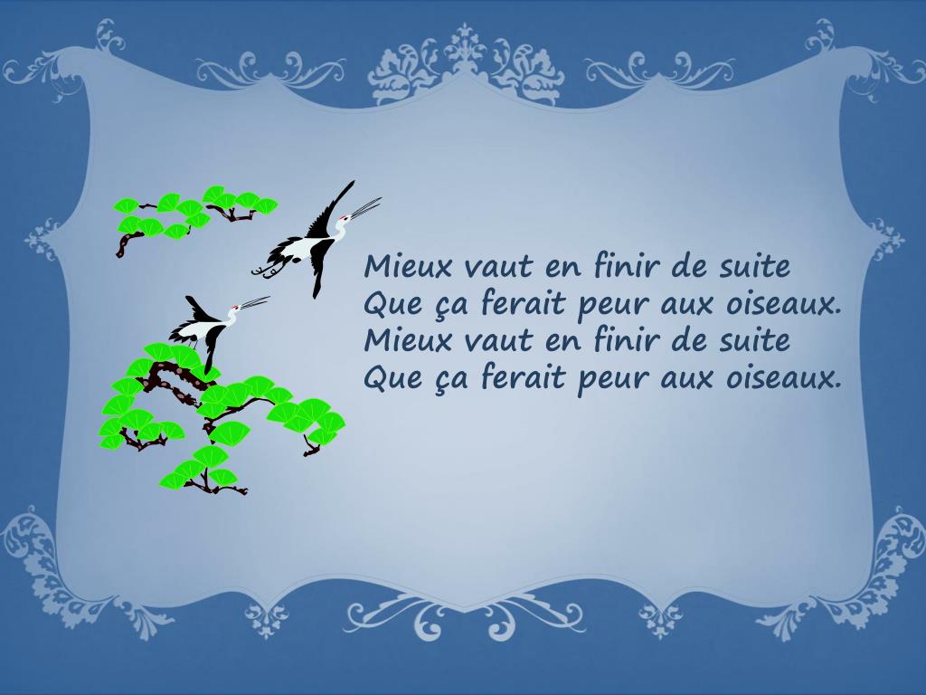 Mieux vaut en finir de suiteQue ça ferait peur aux oiseaux. Mieux vaut en finir de suite Que ça ferait peur aux oiseaux.