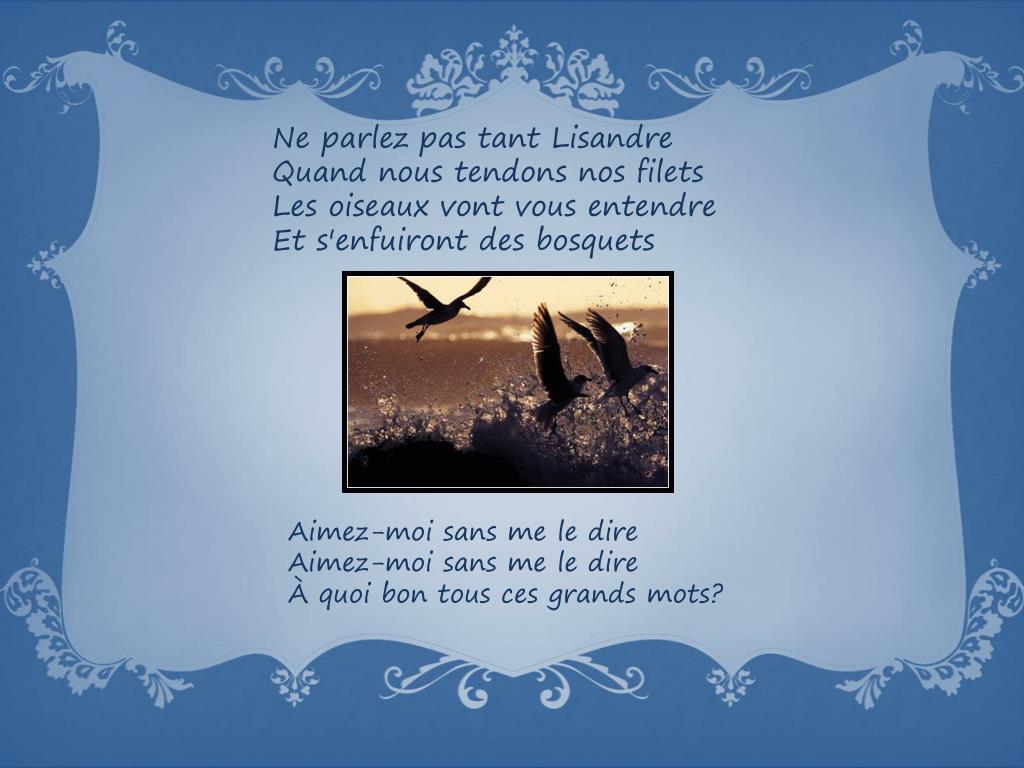 Ne parlez pas tant LisandreQuand nous tendons nos filetsLes oiseaux vont vous entendreEt s'enfuiront des bosquets Aimez-moi sans me le dire Aimez-moi sans me le dire À quoi bon tous ces grands mots?