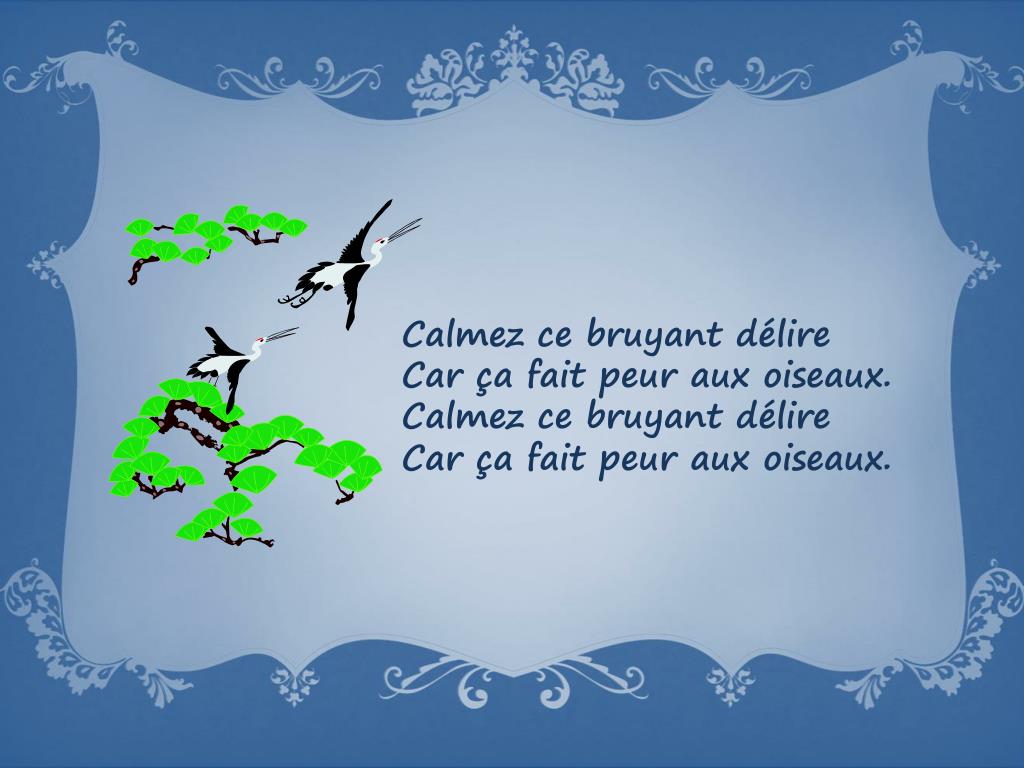 Calmez ce bruyant délireCar ça fait peur aux oiseaux. Calmez ce bruyant délire Car ça fait peur aux oiseaux.