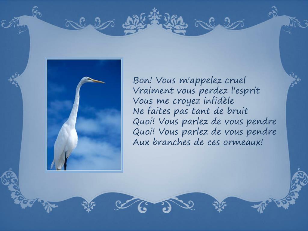 Bon! Vous m'appelez cruelVraiment vous perdez l'espritVous me croyez infidèleNe faites pas tant de bruitQuoi! Vous parlez de vous pendre Quoi! Vous parlez de vous pendre Aux branches de ces ormeaux!