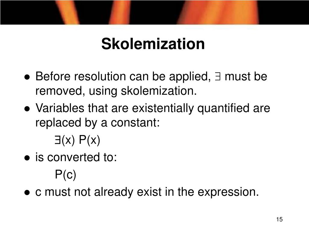 Skolemization • Before resolution can be applied, must be removed, using skolemization. • Variables that are existentially quantified are replaced by a constant: (x) P(x) • is converted to: P(c) • c must not already exist in the expression.