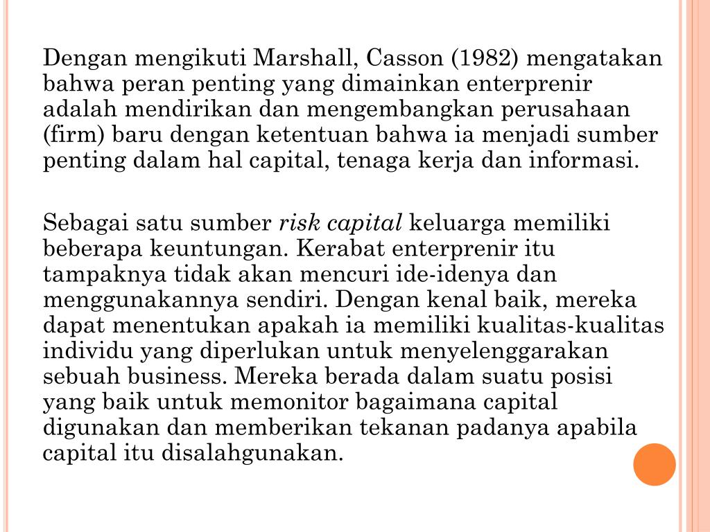 Denganmengikuti Marshall, Casson (1982) mengatakanbahwaperanpenting yang dimainkanenterpreniradalahmendirikandanmengembangkanperusahaan (firm) barudenganketentuanbahwaiamenjadisumberpentingdalamhal capital, tenagakerjadaninformasi. Sebagaisatusumberrisk capitalkeluargamemilikibeberapakeuntungan. Kerabatenterpreniritutampaknyatidakakanmencuriide-idenyadanmenggunakannyasendiri. Dengankenalbaik, merekadapatmenentukanapakahiamemilikikualitas-kualitasindividu yang diperlukanuntukmenyelenggarakansebuah business. Merekaberadadalamsuatuposisi yang baikuntukmemonitorbagaimana capital digunakandanmemberikantekananpadanyaapabilacapital itudisalahgunakan.